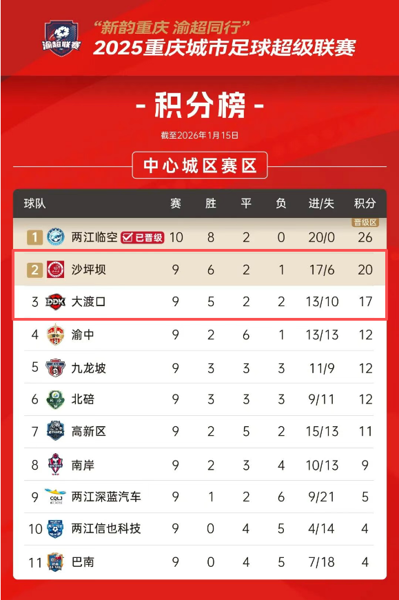 因此,北碚缙云鼎久队“渝超”积分变为12分,彻底无缘八强;沙坪坝陈昌银队的积分则增加到20分,最后一轮只要打平就可以出线。