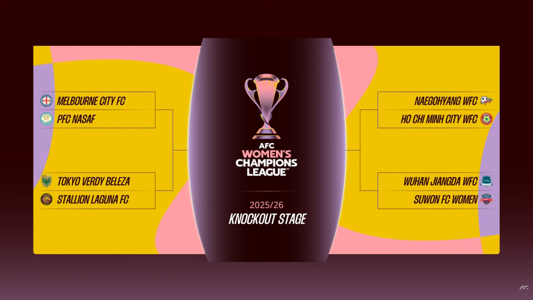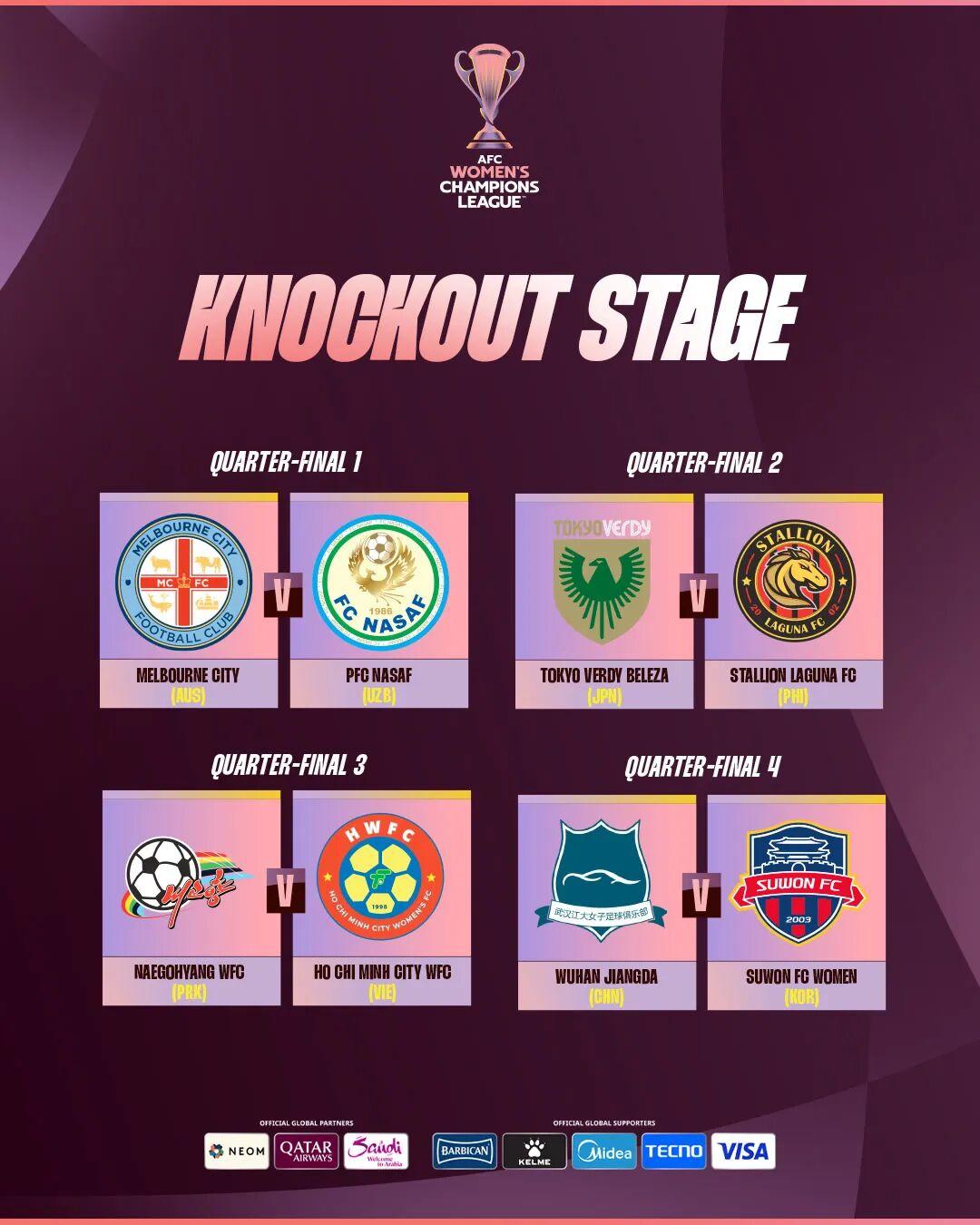 根据抽签结果,八强战上半区对阵为:墨尔本城女足迎战纳萨夫女足,日视东京绿茵美人女足对阵内湖公马女足;下半区朝鲜我故乡女足将面对胡志明市女足,而最受中国球迷关注的武汉女足,则将与水原FC女足狭路相逢。